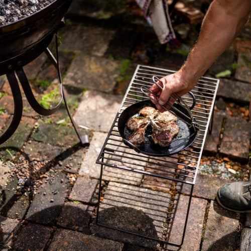 This innovative Trivet Table is designed to protect your surfaces from the heat of hot pans and BBQ cookware, making it an essential accessory for any outdoor dining occasion. Acting as a robust outdoor trivet, it ensures your grass, decking, or patio remains unscathed by the heat, preserving the beauty of your outdoor space. Crafted for convenience and versatility, the Kadai Trivet Table features a unique folding design, allowing it to be easily placed on your outdoor table. This enables you to serve your guest's sizzling dishes straight from the grill. It turns into a practical table when unfolded, providing a secure and heat-resistant surface for hot pans and utensils during your next Kadai BBQ.