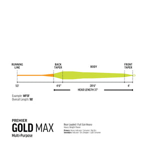 At a full line-size heavy, GOLD MAX is RIO’s most powerful all-around taper for delivering plus-size rigs that get bites in fisheries not centered around long leaders and tiny drys. With the shortest head length in the GOLD class, MAX is the right fit for smoothly loading weightier, unwieldy payloads. The short head carries more weight toward the back of the body so anglers can turn over heavier rigs more efficiently, while the shorter front taper combined with tapered body roll-casts bulkier rigs with ease, mends effortlessly at distance and delivers large drys with finesse. For powerful versatility, GOLD MAX lets you cast more weight under control, while also allowing for presentations decidedly cleaner than overly front-loaded line configurations.